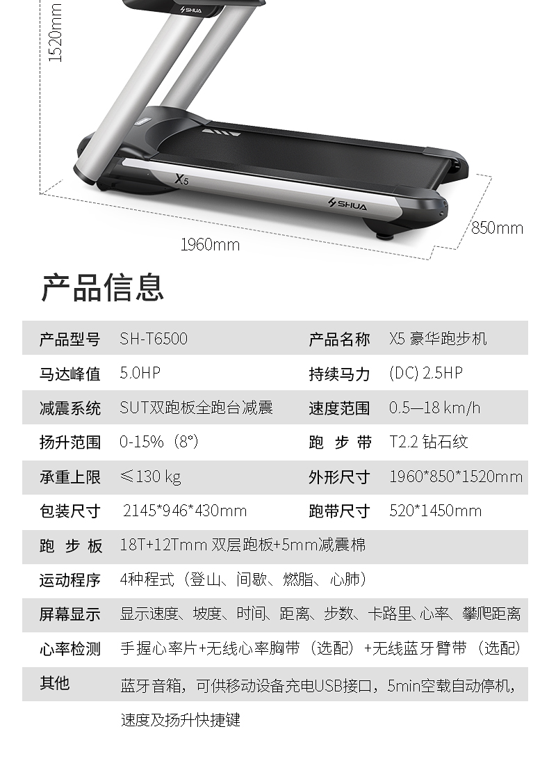 • 產品名稱:SHUA/舒華跑步機家用靜音豪華健身運動器材新X5/SH-T6500 新x5升級版