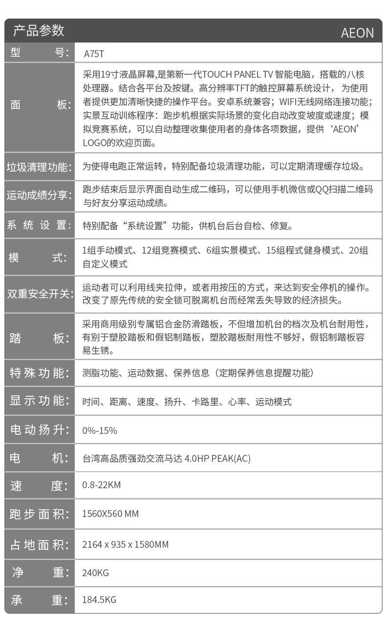 • 產品名稱:AEON/正倫大型商用跑步機A75T專業智能專業健身房健身器材